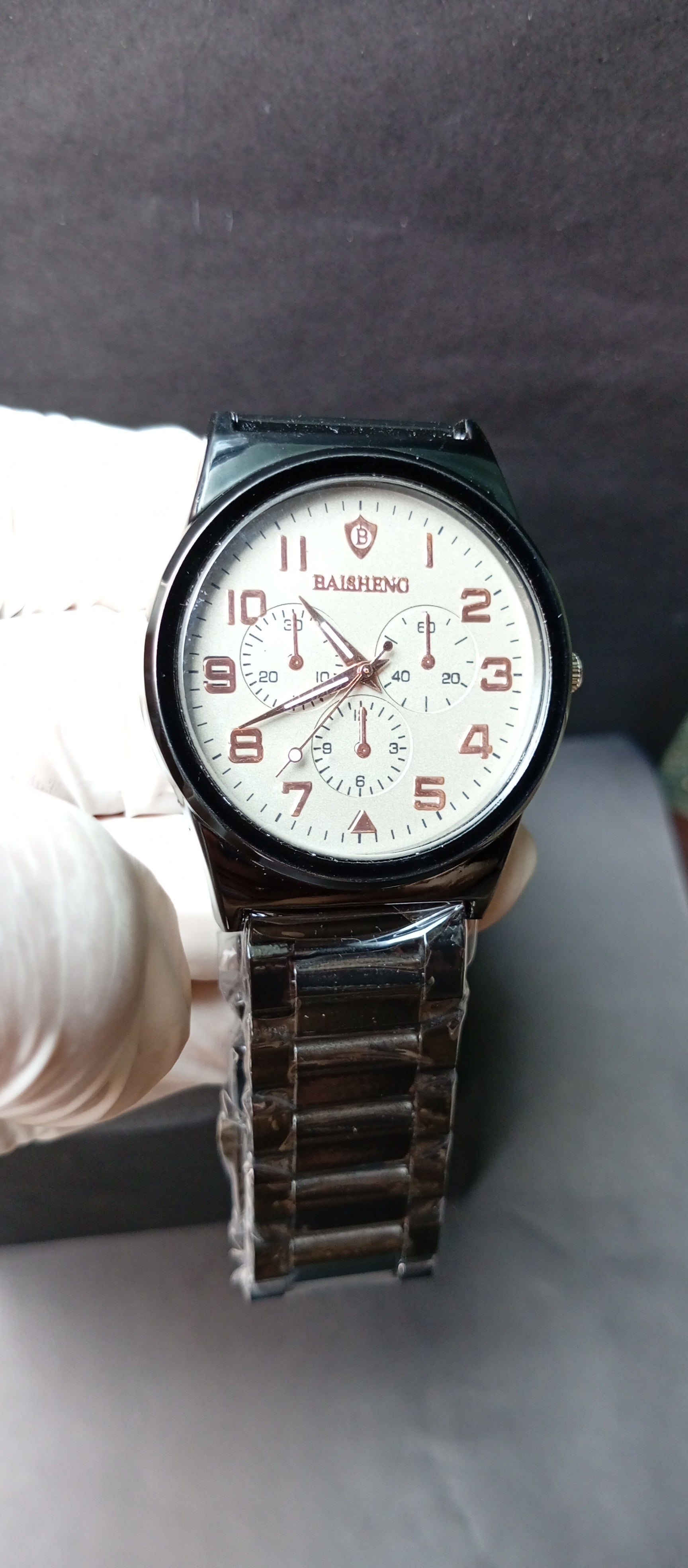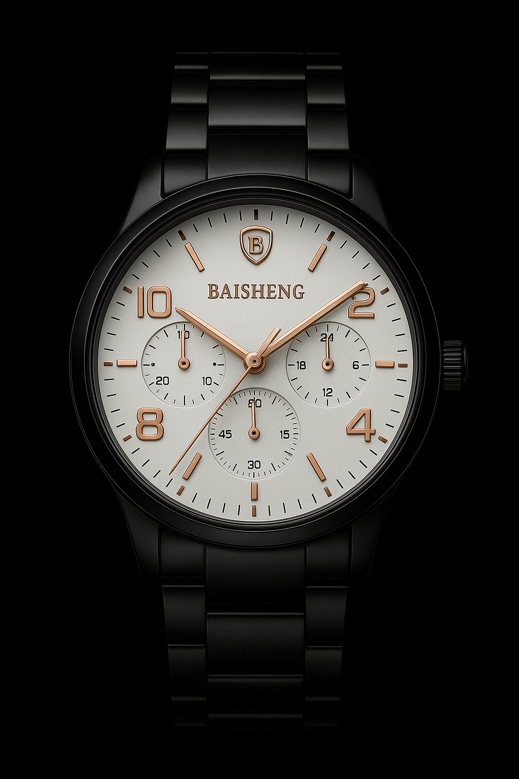 Elevate your style with this Baisheng-inspired black & white watch. Featuring a premium black chain strap and a white dial with decorative sub-dials, this watch offers a perfect balance of elegance and modern design. The iconic “B” logo adds a signature touch to your wrist.