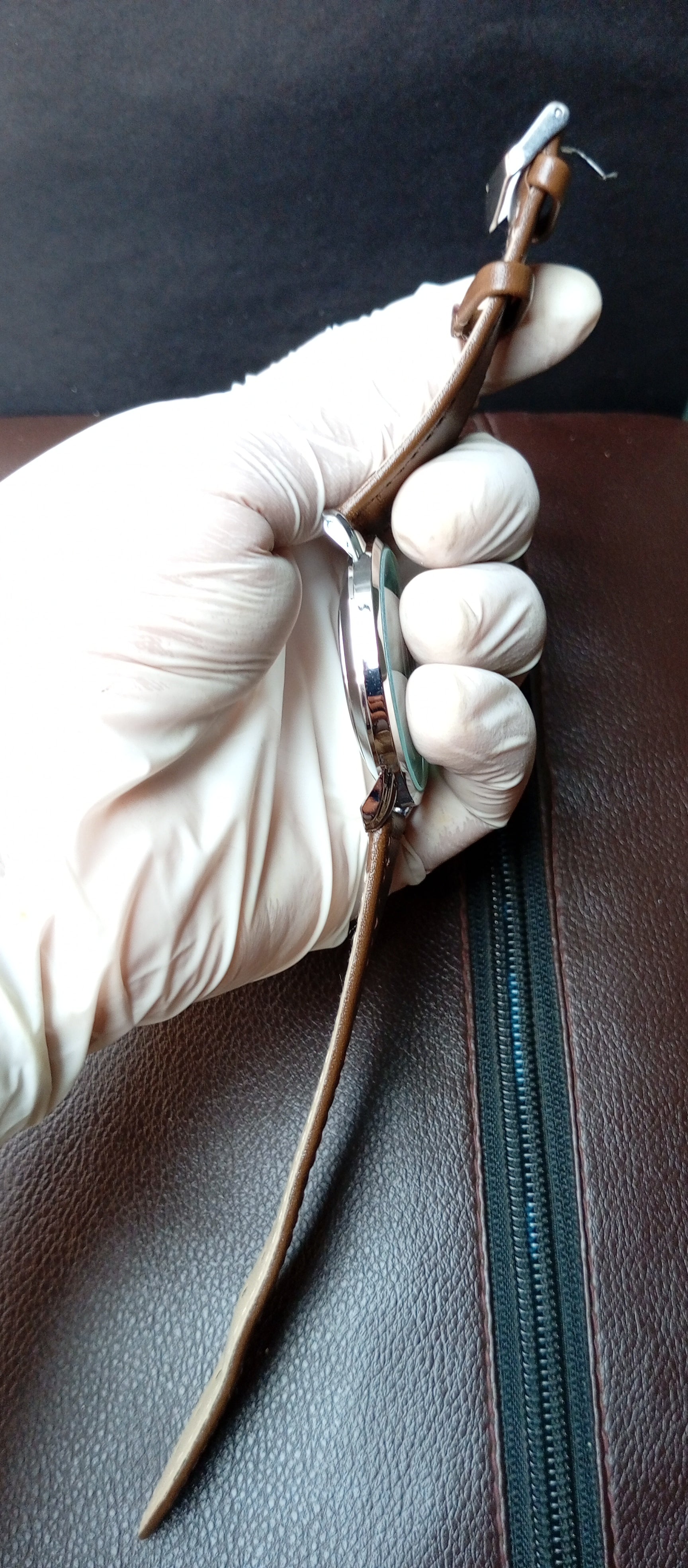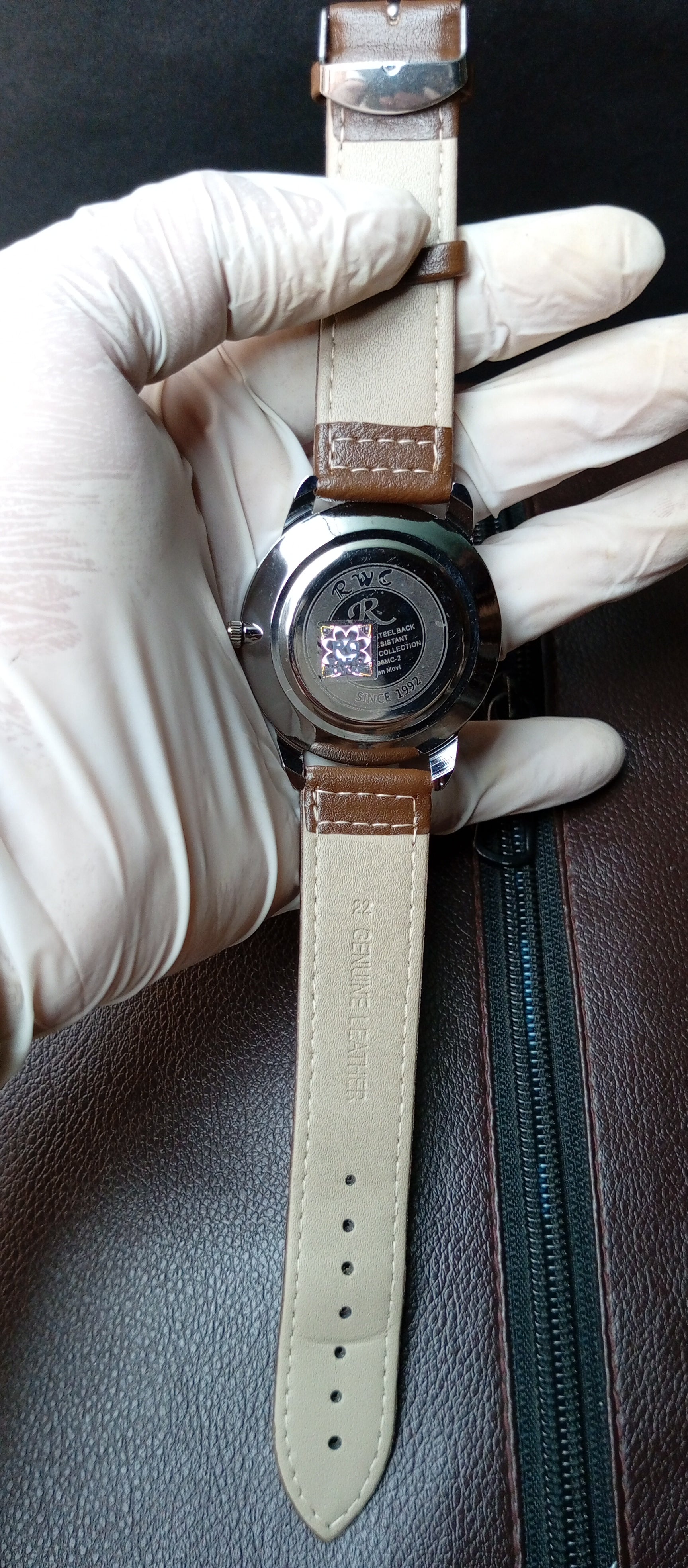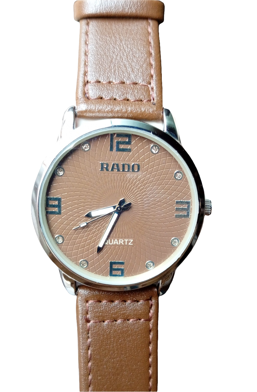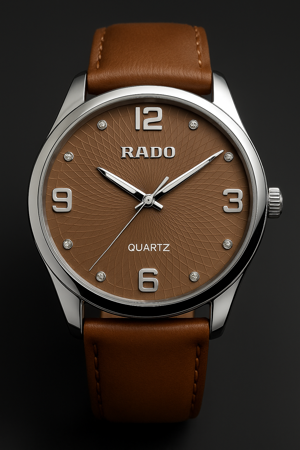 Elevate your wrist style with this Rado-inspired bronze leather watch. Featuring a premium bronze leather strap and a silver dial ring, this watch combines elegance with sophistication. The dial is adorned with numbers accented by stones, adding a luxurious touch, while the silver buckle ensures a secure fit.