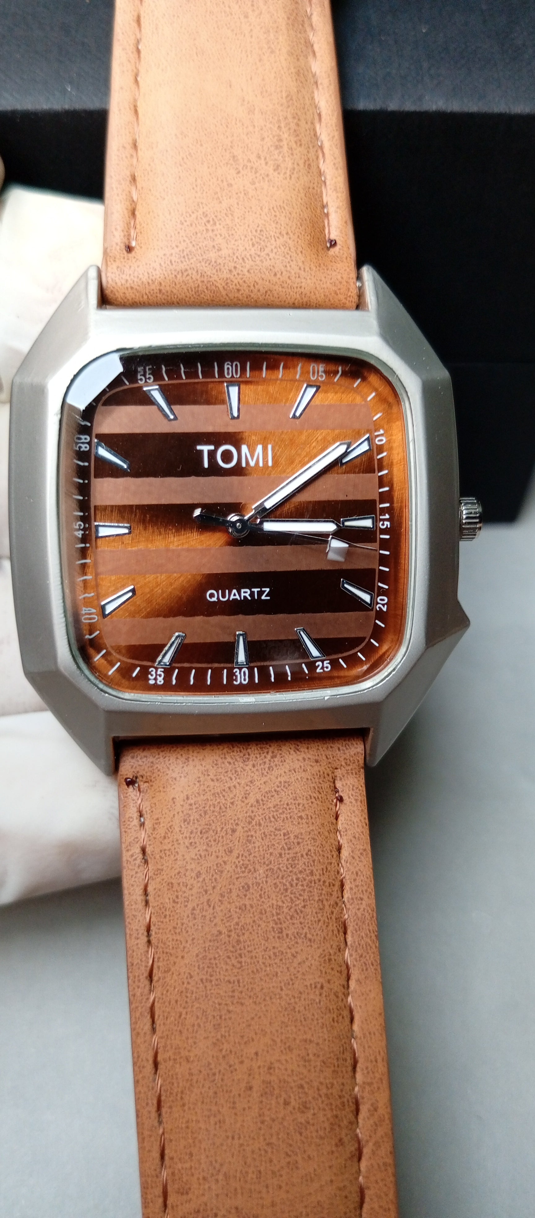 Upgrade your style with this TOMI-inspired luxury watch. Featuring a premium bronze leather strap and a square gray dial with shiny bronze inner face, this watch combines elegance with a modern touch. The shining glass enhances its sophisticated appearance, making it perfect for any occasion.