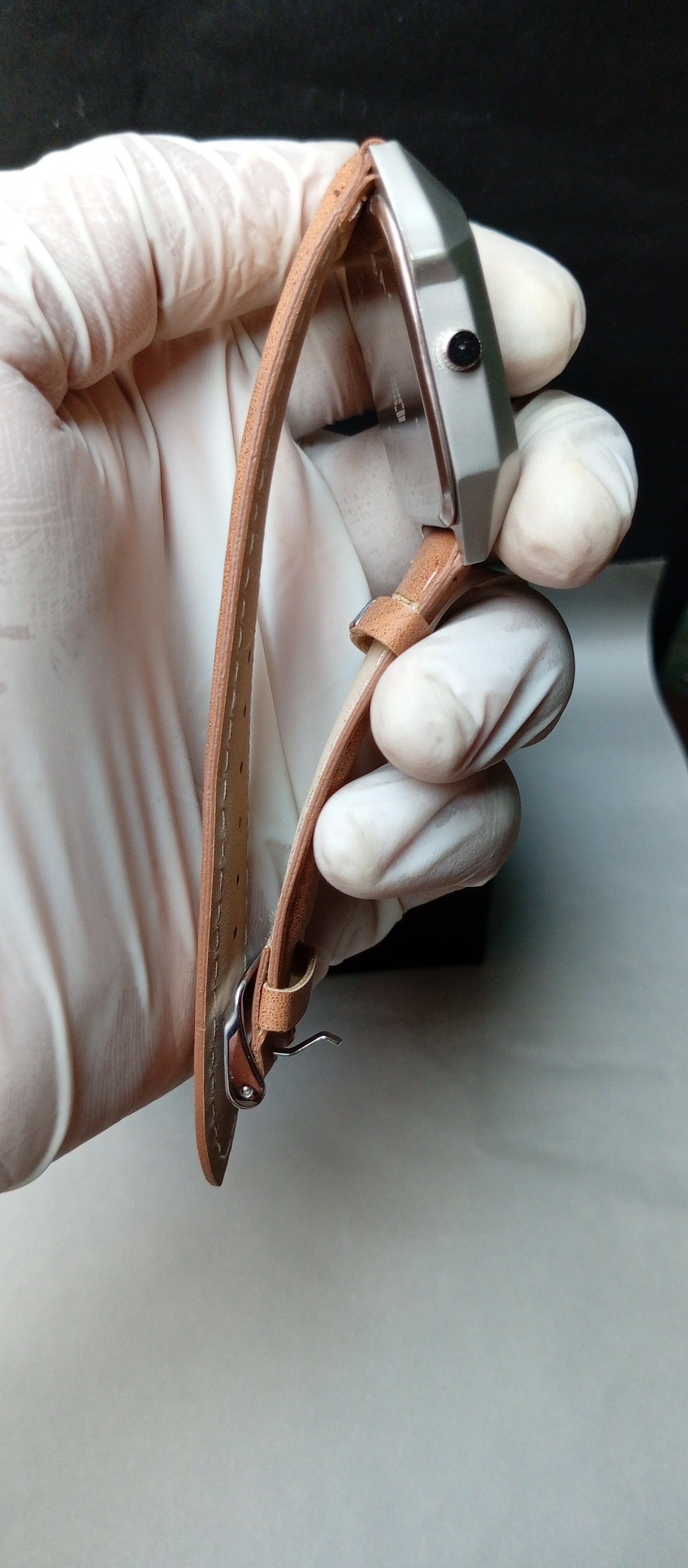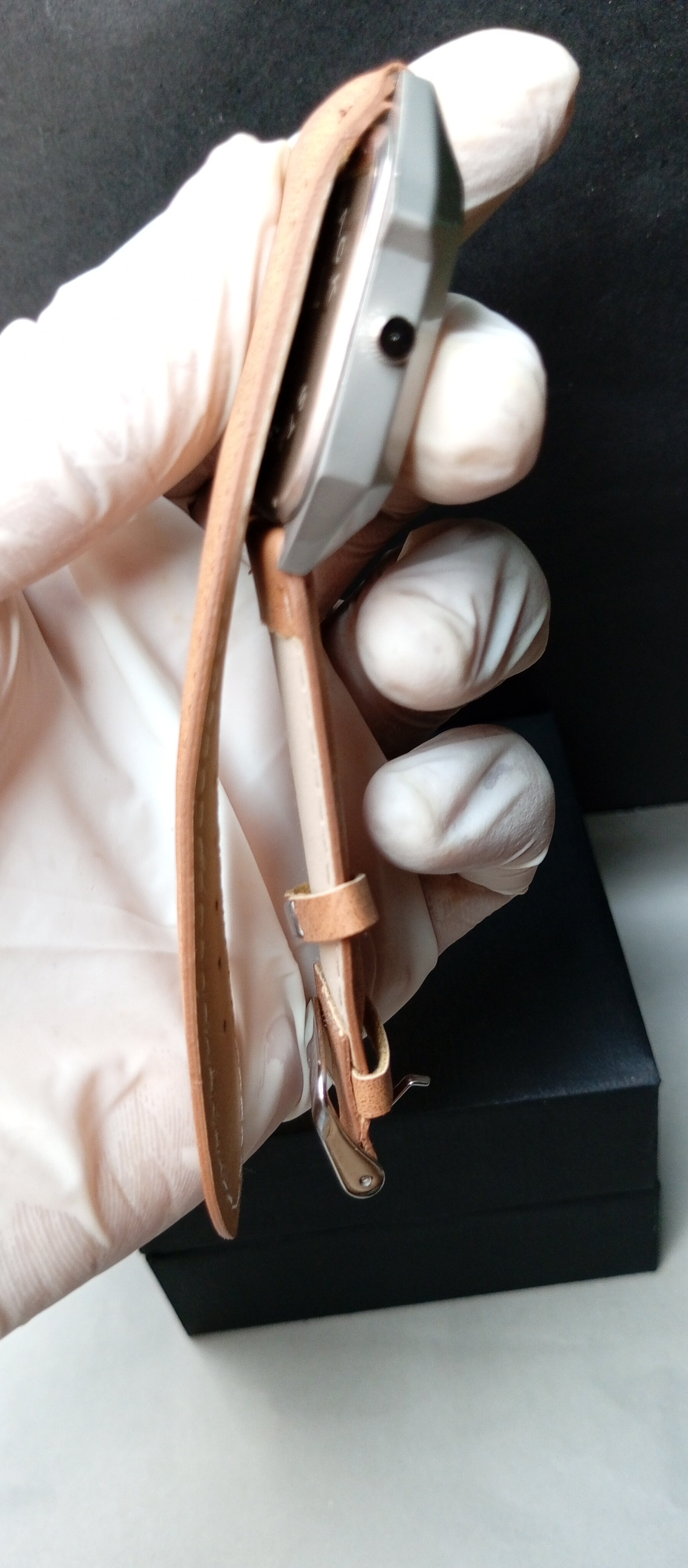 Square gray dial with shiny bronze inner face